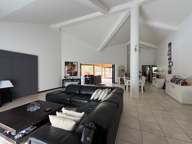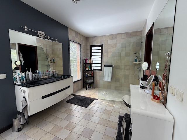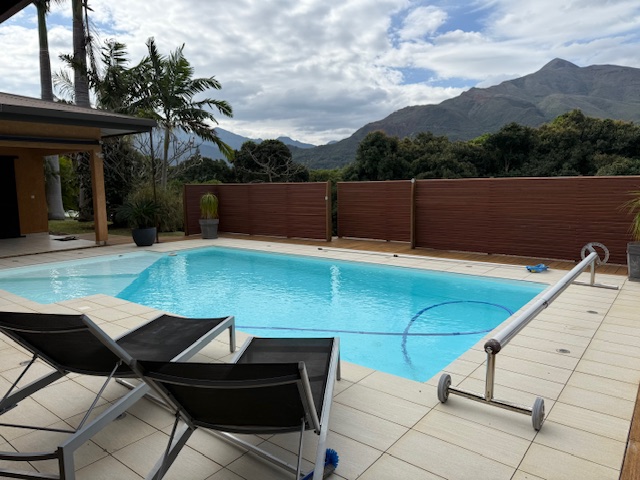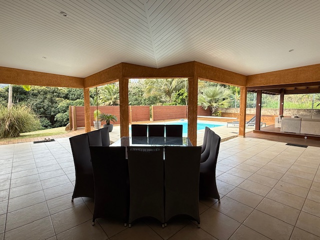 Située en impasse, sur les hauteurs de Koé, sur un terrain de 33 ares arboré et clôturé avec portail électrique, belle et spacieuse villa F4 meublée de 190 m².
